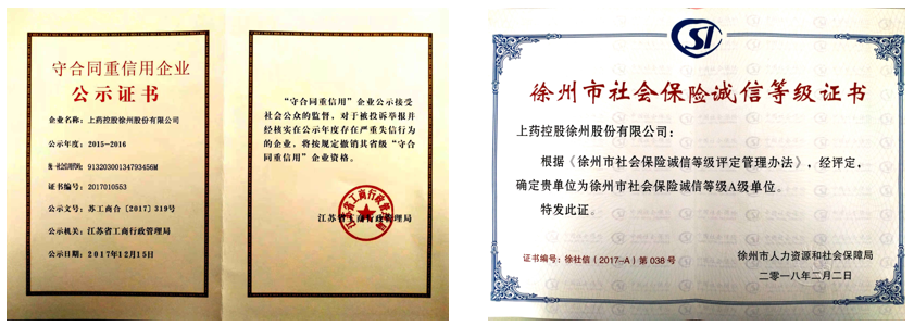 上药控股徐州股份有限公司荣获了江苏省“守合同,重信用”企业、徐州市社会保险诚信等级A级单位两项光荣称号。